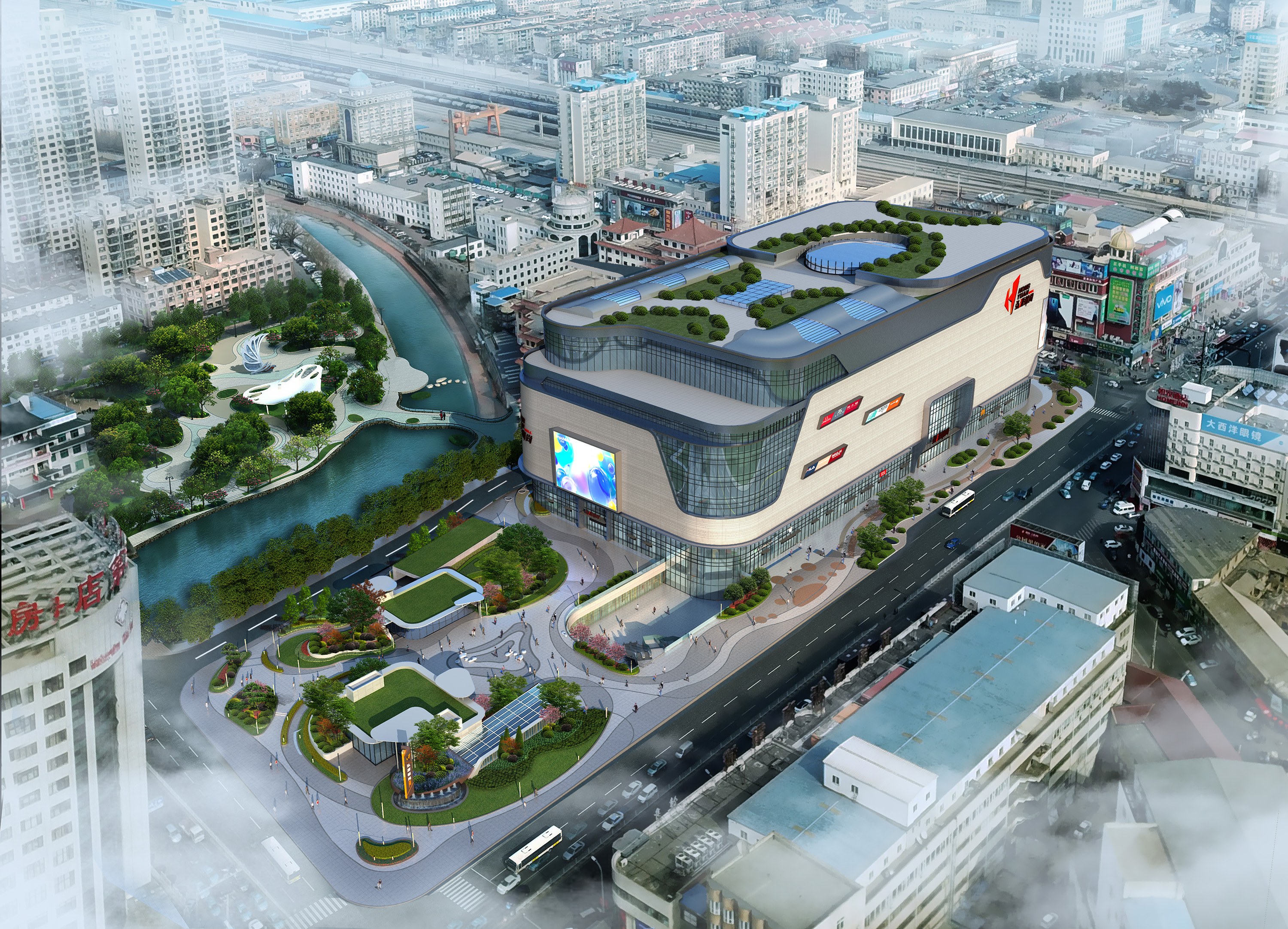 项目为集中商业,体量约13万㎡,地上8层,地下3层。项目外立面设计前卫,极具辨识度,西侧大型绿化广场及下沉式广场,具备强有力的聚客条件和极强的展示性。