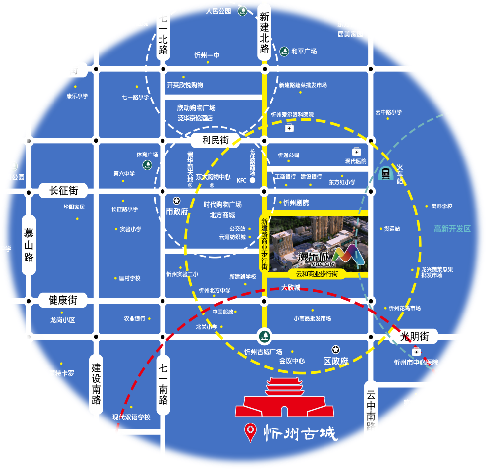 项目位于忻州市忻府区新建路商业步行街,西至新建南路,南连云河街,东接云中南路,属城市核心商圈,商业氛围浓郁;项目周边成熟社区环绕,属地客群可为项目提供良好的客群基数。交通便捷,距离“忻州古城”约1公里,距忻州火车站约1公里;区位优势显著,未来将带动忻州周边半径30公里人群消费;在资源优势、位置优势等诸多有利条件的加持下,势必为项目带来非凡的商业价值与潜力。