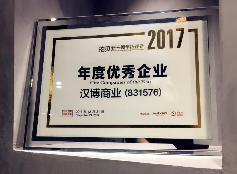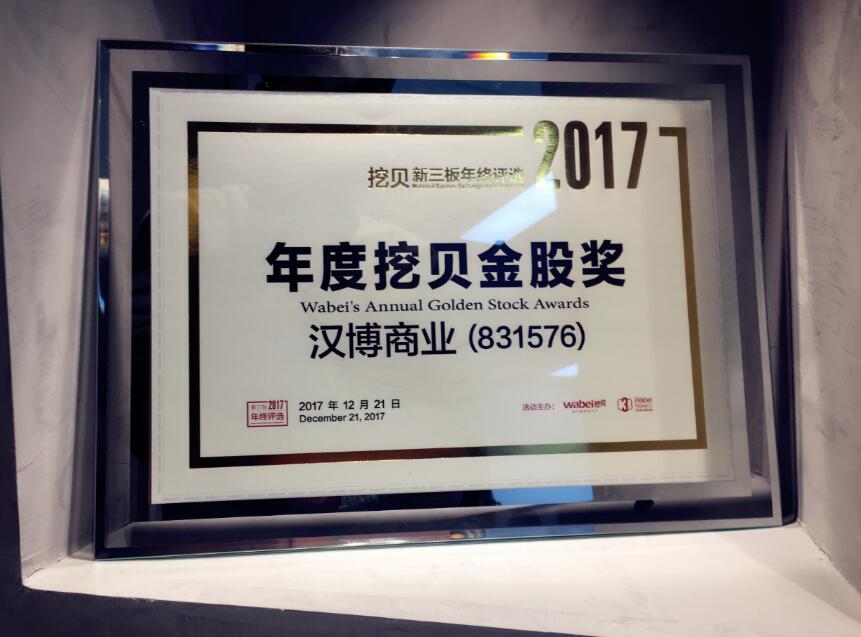 会上进行了“2017挖贝新三板金股奖”的颁奖仪式,该奖根据之前挖贝新三板研究院发布的《2017挖贝新三板最具成长性企业TOP100》榜单进行颁奖。其中,汉博商业荣获“2017年度挖贝金股奖”和“2017年度优秀企业”两项大奖。