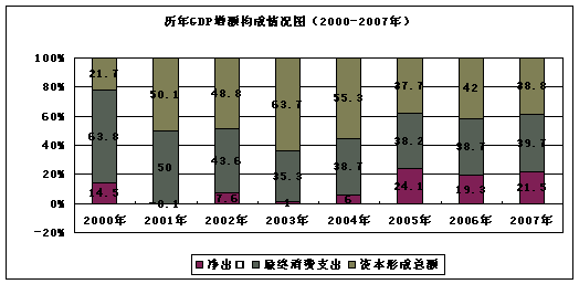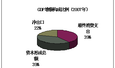 近年来,随着国家一系列扩大消费政策的出台,消费增长有所加快,2007年最终消费对GDP增额的贡献率已超过资本形成(政府支出与投资),但从一个更长期的过程来看,2000年—2007年,消费对经济增长的贡献率从63.8%下降为39.7%,而同期资本形成的贡献率由21.7%上升到38.8%,净出口的贡献率由14.5%上升到21.5%(图4)。