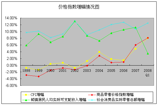 图7:历年价格指数增幅情况图(1998年至2008年第一季度)