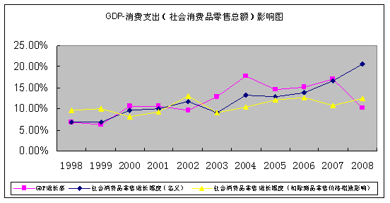 近几年,CPI和商品零售价格指数快速上升,扣除商品零售价格指数的影响,社会消费品实际零售总额增幅在07年有所放缓,但08年第一季度呈现回升趋势。