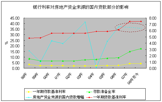 但单纯地提高存、贷款利率又有可能导致国际热钱的投机涌入(央行存、贷款利率总是随着美国央行存、贷款利率的提高而提高、降低而降低,但是实际利率总低于美国利率正是基于此);这样一来,在美国降低利率以达到促进消费目的的情况下,国家只能在小幅度内提高存、贷款利率(图9),而这对抑制国内投资收效甚微,唯一可行的则是提高银行存款准备金率;对房地产行业来讲,其资金来源国内贷款部分可能会受影响,需要更多地依赖自筹部分。