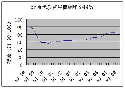 图14:北京优质首层商铺租金指数(98年至08年第一季度)
