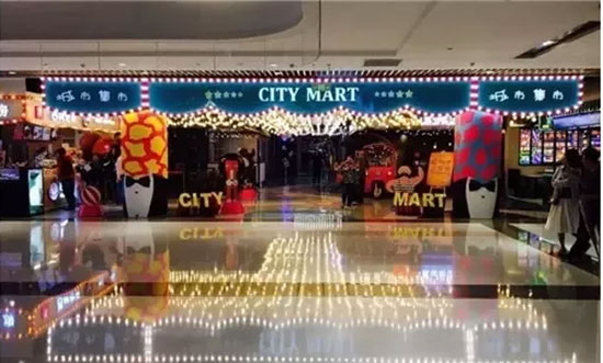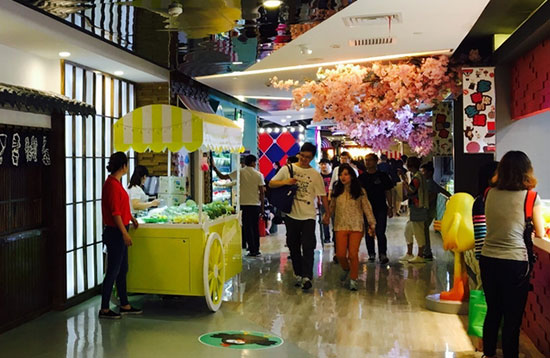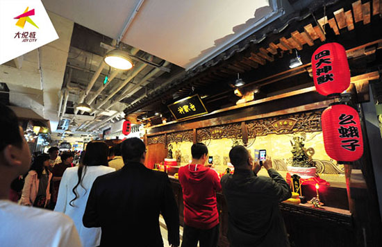 上海合生汇的城市市集“CITY MART”主打餐饮中的小吃类,其亮点在于门面装饰设计,吸引众多人群驻足和拍照留念。