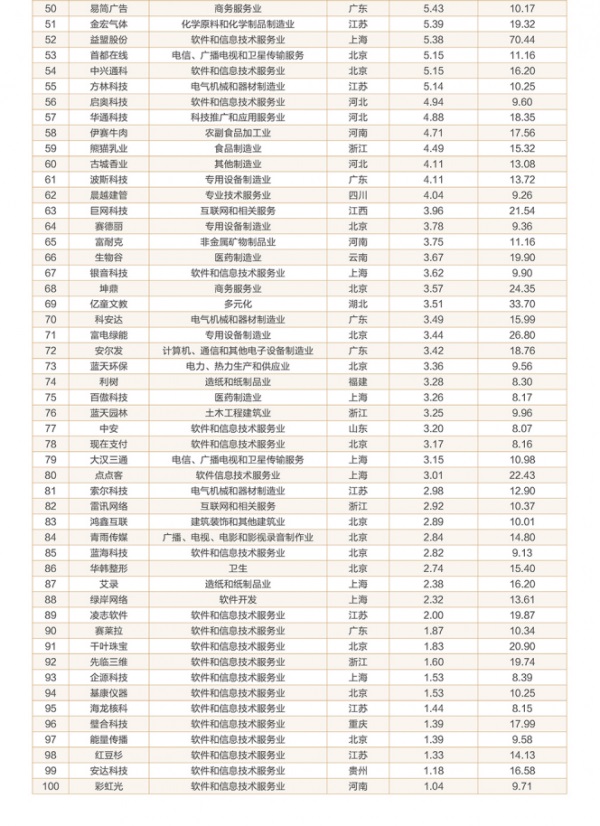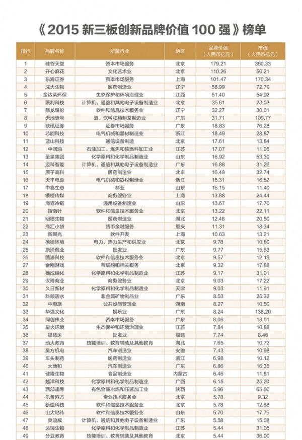 据介绍,“2015新三板品牌价值100强”入选企业是在7000多个新三板挂牌企业中筛选后得出的,分布在44个行业内。它是国内首次对新三板的品牌价值进行排行,也是唯一采用市场期权法修正收益法来计算品牌价值的排行榜,榜单更侧重于企业品牌价值的未来发展潜力,这也恰好符合新三板企业的特性。该榜单对于投资者投资新三板企业提供了新的价值参考。
