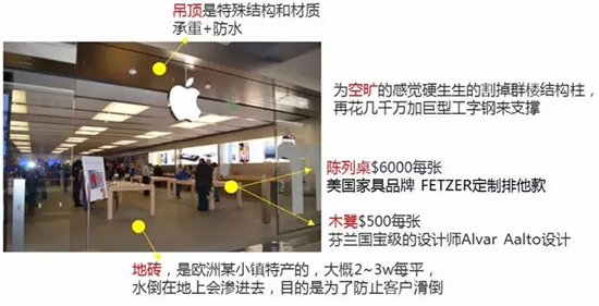 Apple旗舰店为了诉说‘将用户体验做到极致’的理念,乔帮主重金邀请设计大师,亲自挑选每样设计元素,追求极致,并于2013年,将苹果店面设计注册成商标;如此的精心打造,才能创造无与伦比的感受,才会成为精神图腾。