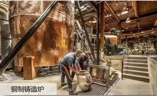 入门就见一个 32 英尺高(近10米高)的铜制铸造炉,顾客可以近距离看到咖啡豆被送入烘焙机、进入一个高约10m的闪闪发光的大铜炉、再到煮泡完成的全过程。