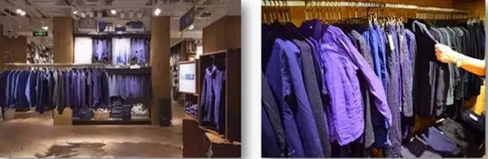 外在1F的服饰区域,还可以看见一片深蓝色服饰区,是新导入的Re MUJI商品群,展示和售卖从生产到销售最前线的过程中产生的可再利用的衣服。