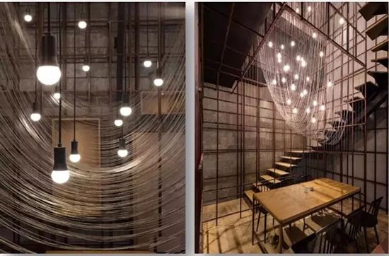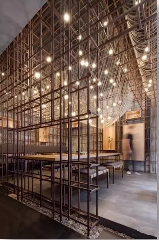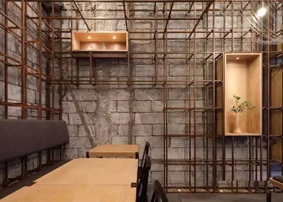 前台嵌缀着曾用于浇筑混凝土的竹模,与外立面相呼应。转身步入用餐区,围绕着铁架子的光晕让空间很丰富,钢架呢,是很工整的中国式拼法。