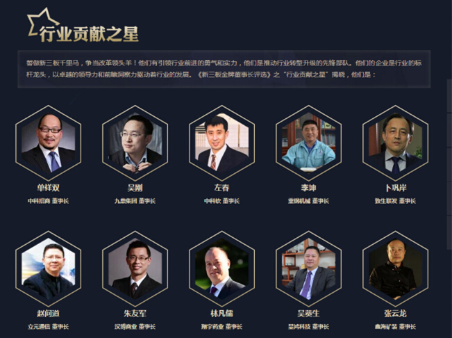 自4月开展以来,评选获众多企业参与。网络票选截至6月底总计获超2000万投票数;同时,新三板领域知名专家学者、券商新三板分析师及媒体人等共同组成评选团队,从企业的商业模式、科技含量及持续成长性、企业董事长的前瞻性、领导力及变革力等方面对入围企业家进行了综合评估。