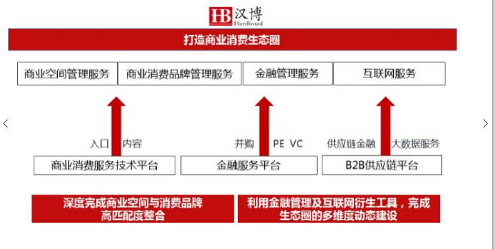 总而言之,汉博商业围绕商业消费领域打造了商业消费服务技术、金融服务和B2B供应链三大平台,用专业技术服务平台做两端,场所当入口,品牌当内容,再用金融和互联网服务为其业务提供支撑,形成一个从场所到空间、再到金融、互联网的整个消费端的闭环,打造具有汉博商业特色的“商业消费生态圈”。